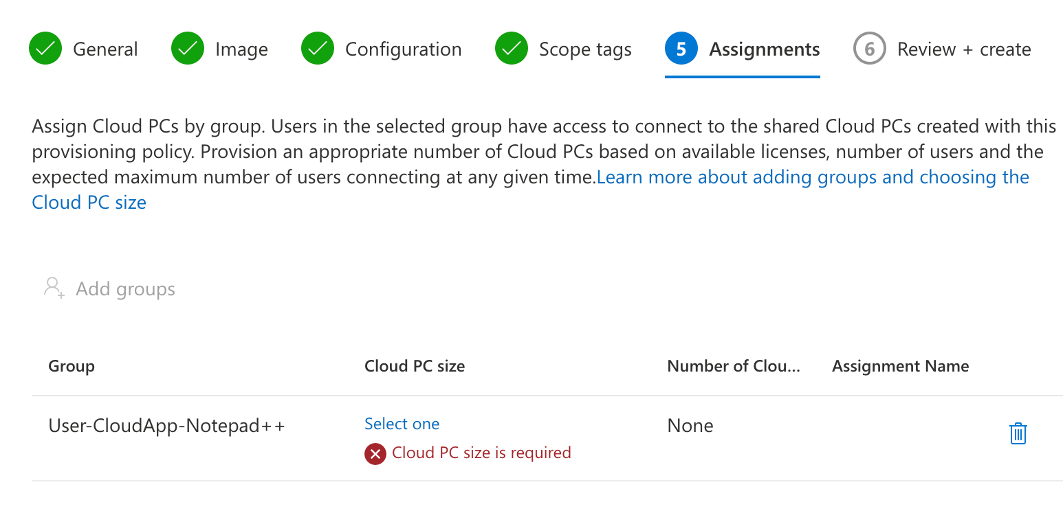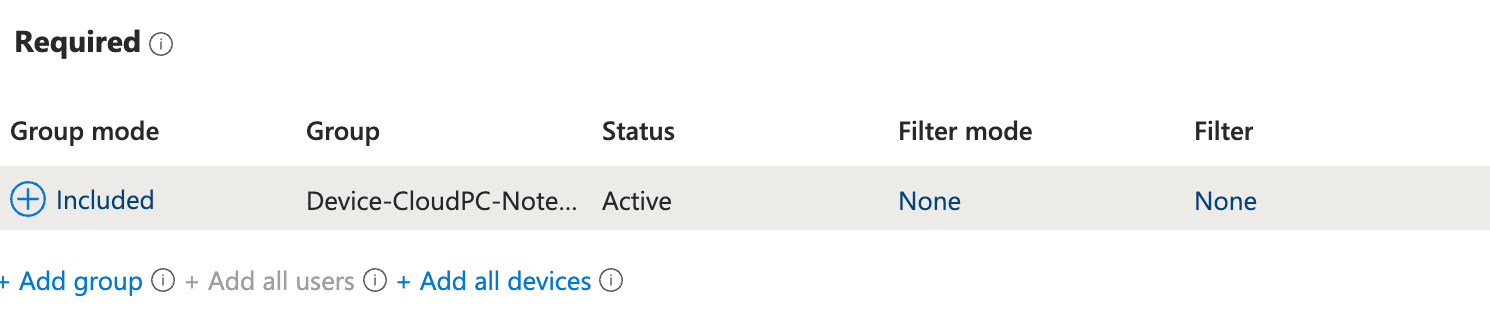 To make sure the application that we want to publish as a Cloud App is installed onto the Cloud PC during the preperation phase. So, we add the device group created previously as a required assignment to the app.