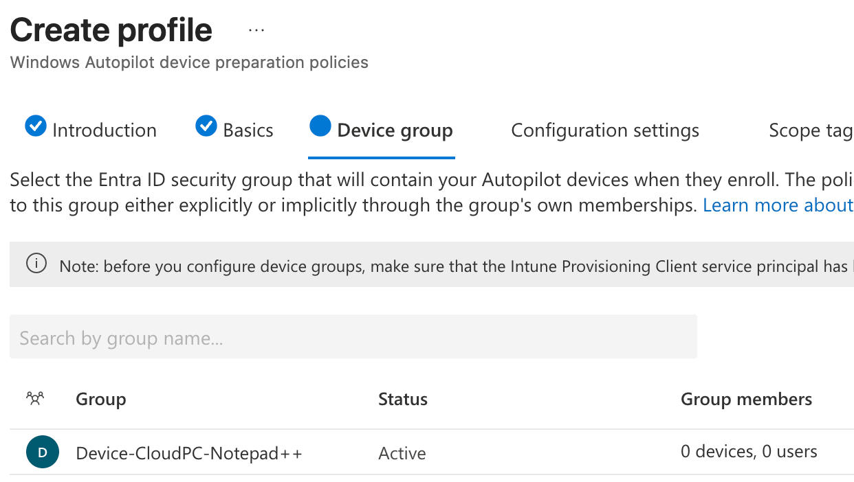 When setting up the group, make sure you add the Intune Provisioning Client or Intune Autopilot ConfidentialClient as an owner off the group. This will grant access for the Device Preperation Policy to add the provisioned Cloud PC’s to this group. If you don’t see one of these Service Principals (with the App ID f1346770-5b25-470b-88bd-d5744ab7952c) in you environment, you can use the instruction on Microsoft Learn to add the Service Principal.