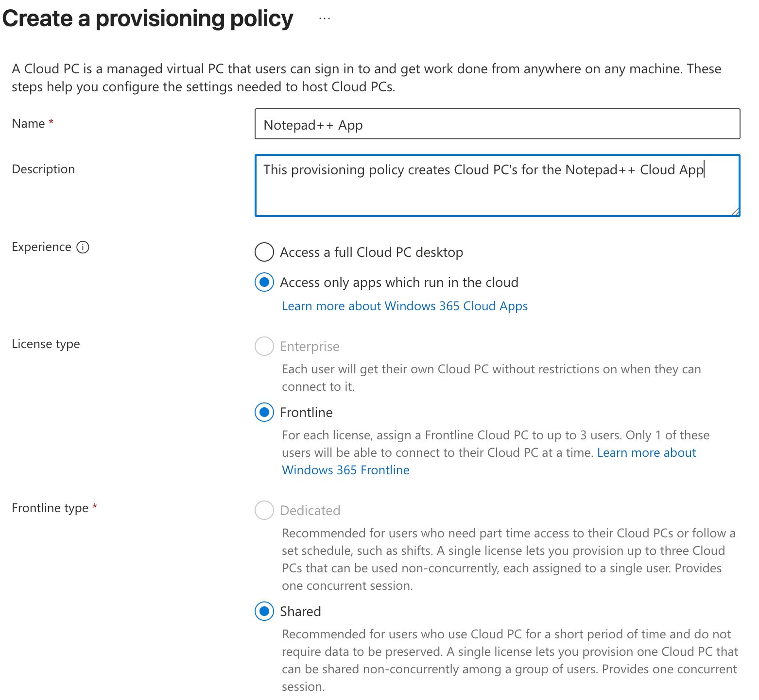 Apart from, obviously, naming it and providing a description, we’ll select the option to ‘access only apps which run in the cloud’. This will automatically set the license type to frontline and shared, as this is the type of licsense used for Cloud Apps.