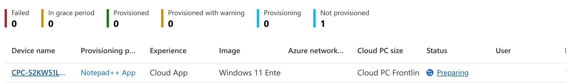 We’ll have to wait for a while… Like described earlier, the first step is the Cloud PC provisioning. After that, the device preperation policy will take over and the Cloud PC will be in a preparing state.