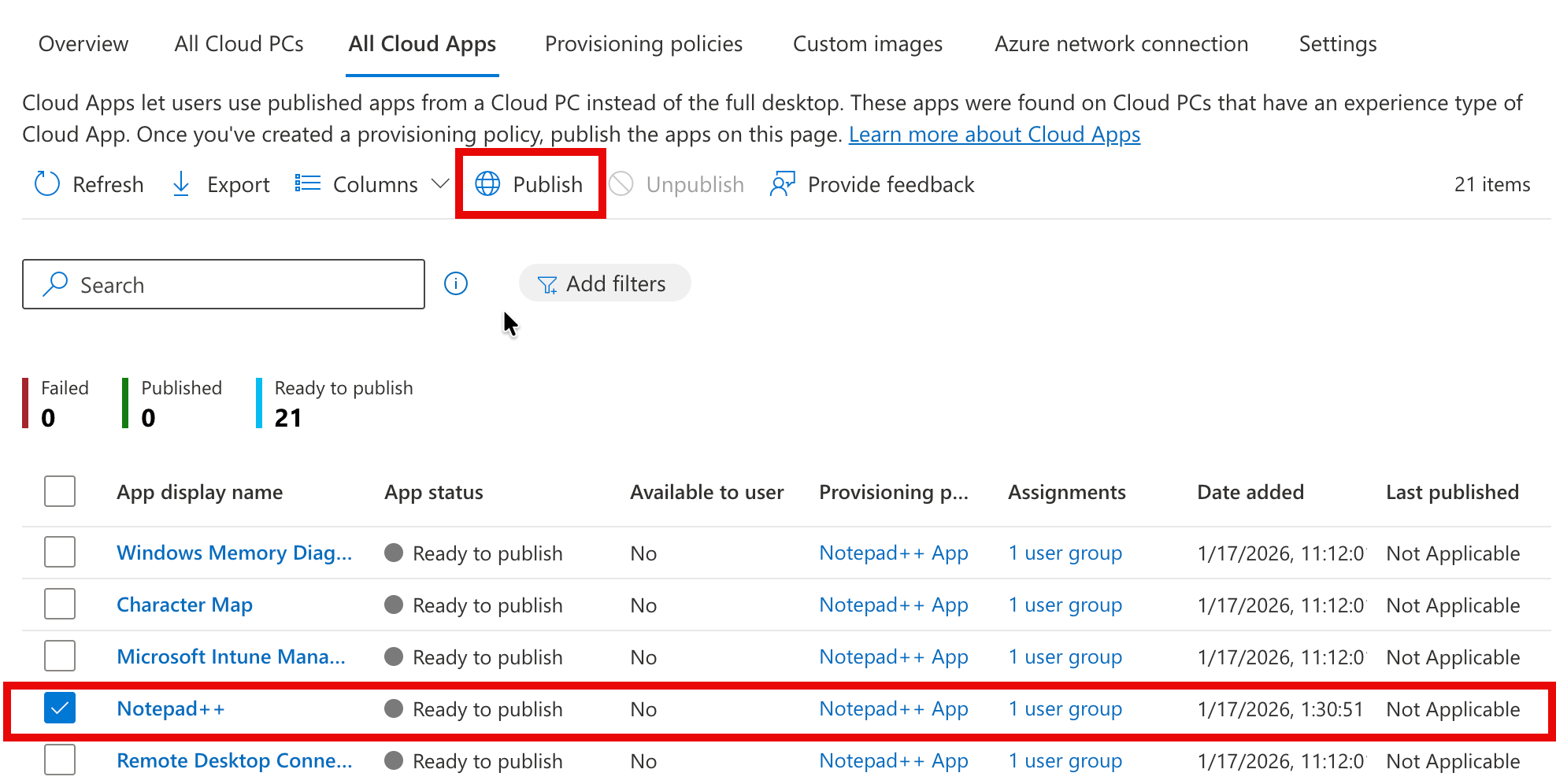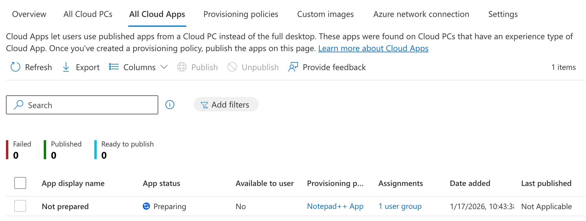 Now that the Cloud PC configuration is set up, it’s time to get to the actual Cloud App publishing. We’ll switch to the ‘All Cloud Apps’ tab in the portal. Here, we should see a list of all Cloud Apps that are on the Cloud PC’s created with a provisioning policy for publishing apps. In this case, as our Cloud PC is still in a provisioning state, no app is shown yet.