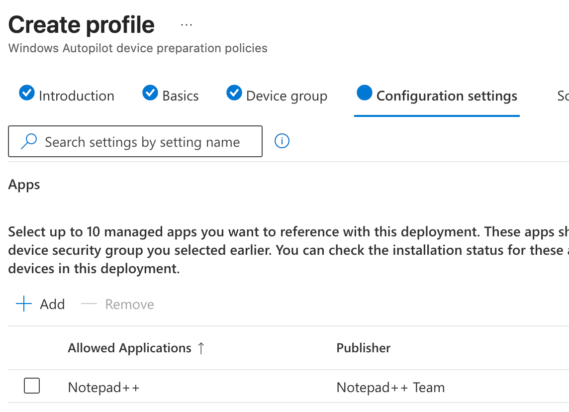 On the ‘configuration settings’ tab, we’ll select the app we want to install on the Cloud PC, so the Device Preperation Policy will take care of installing the app in the Cloud PC.