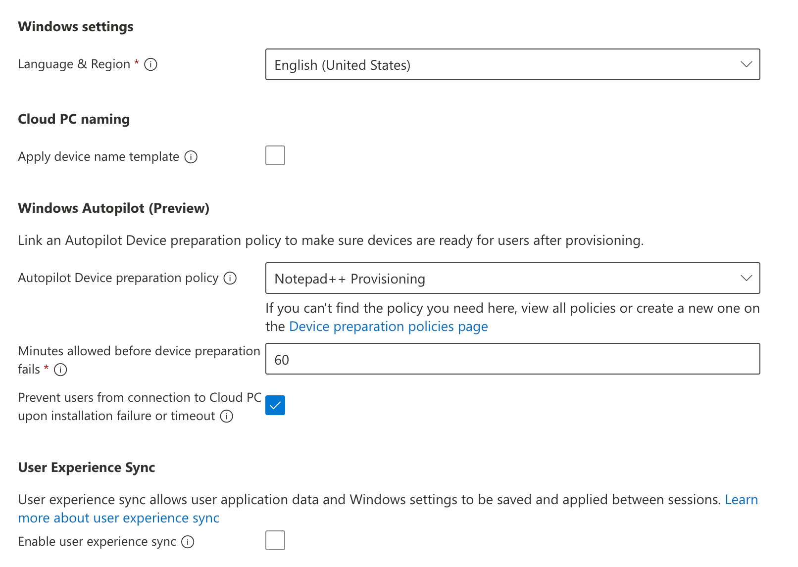 We choose the language and region to be used within the Cloud PC, we can define a naming template if we want to, and we’ll select the prepartion policy we created earlier. This will make sure that after the initial provisioning of the Cloud PC is done, the selected apps will be installed and the Cloud PC will be ready for use. We can also configure User Experience Sync if we want to.