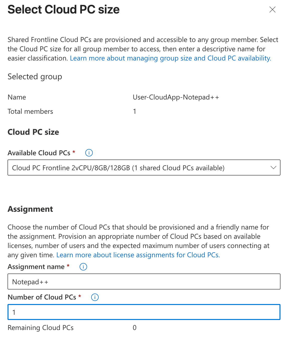 Your available Frontline licenses will show here, so you can select the right one. You enter a name for this assignment, and you provide the number of Cloud PC’s that should be provisioned. This will be the number of cuncurrent users you can have using this app.
